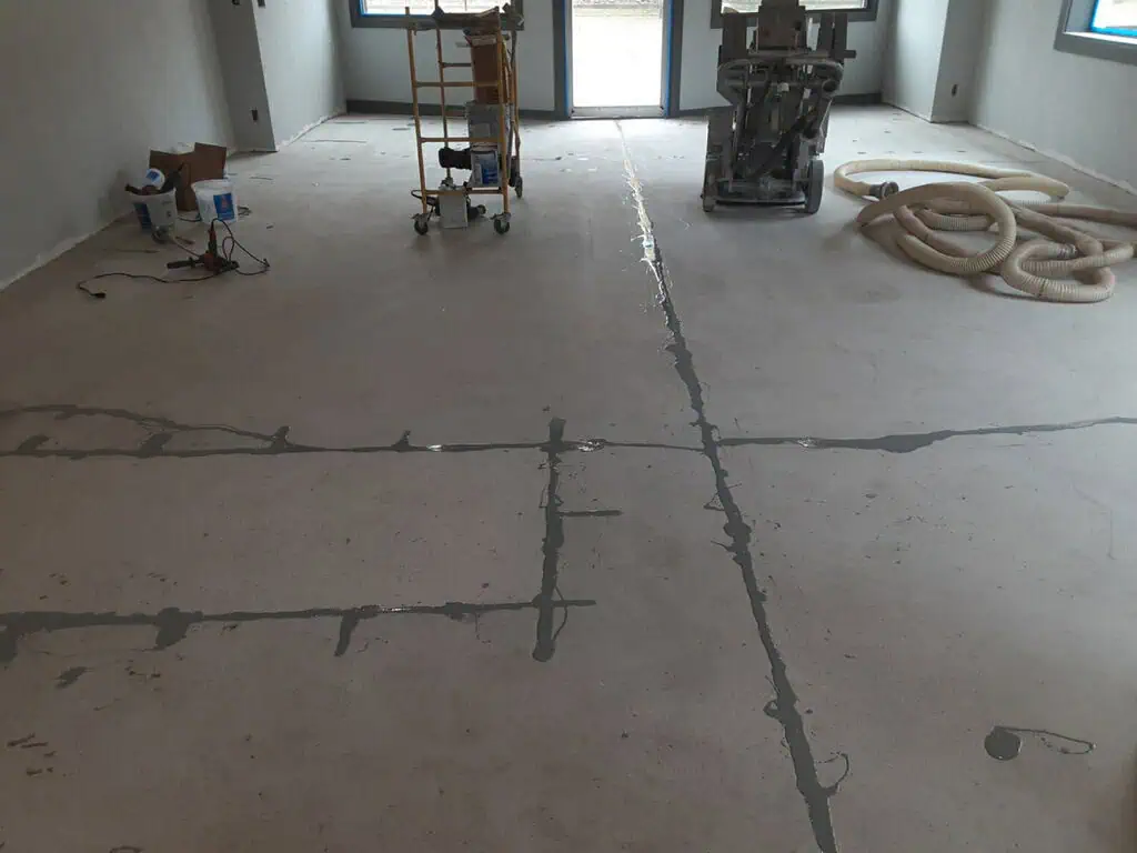 This was a 100-year-old building being converted into a new restaurant. In the dining area, we Diamond ground the concrete to remove all the old adhesives from the existing floor coverings. We used a large diamond grinder and went over the floor with 30 grit, filled all cracks, and patched all damage on the floor. We then continued to grind using 80 grit and 150 git diamonds to smooth the floor. Once all patching, crack filling, and grinding was done we stained the floor using an acetone concrete stain. This followed by applying a low gloss clear sealer. In the kitchen and back of the house, we performed diamond grinding, patching, and crack filling followed by applying a two-coat urethane cement coating.