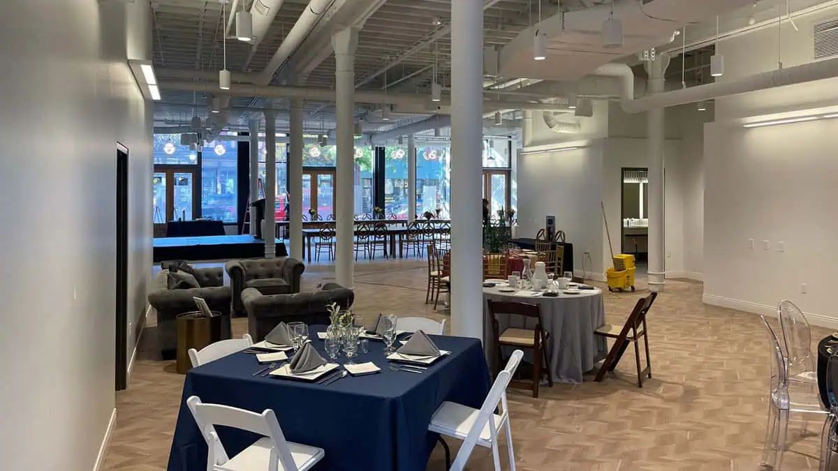 Built with roots in Kalamazoo’s rich history, the Haymarket Event Center initiated a thoughtful interior renovation. The goal was to maintain its historical essence while creating a visually stunning backdrop. A key element of this transformation involved painting the exposed rough-cut timber ceiling and drywall, enhancing the venue’s rustic elegance with a modern touch.