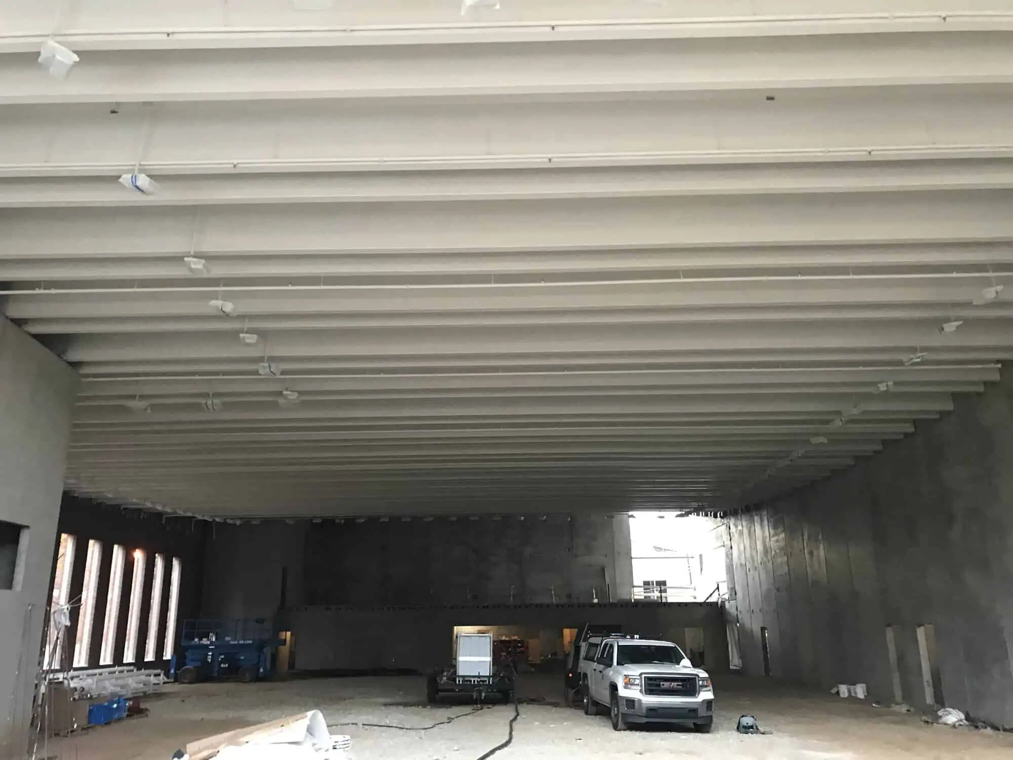 Before we painted the concrete ceiling in this new Natatorium we vapor blasted the concrete surface. This allowed the right surface profile to accept a strong epoxy primer and topcoat system.